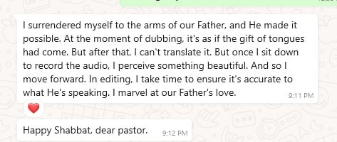 So, we will carry the message forward wherever we are, and God has given me the opportunity to be his minister, you could say. That's what my mom told me at some point. Well, today I'm going to dedicate myself more fully, full-time, out of season, whatever it takes, to make known this wonderful message that the Father delivers. Thank you for listening to me, and we will have another opportunity perhaps if I have the chance to be here next year.